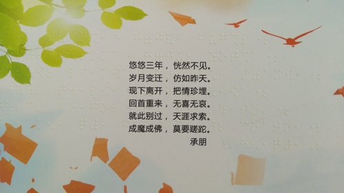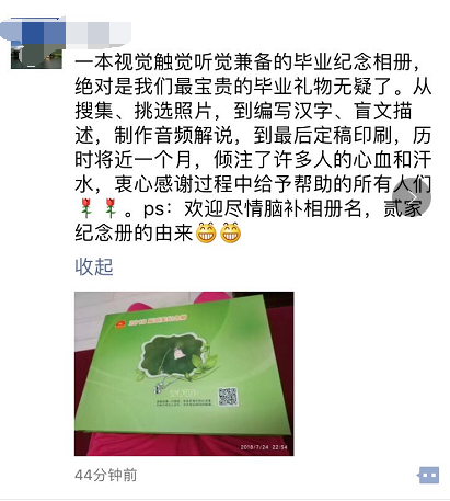 感謝所有為“盲文畢業(yè)紀(jì)念冊”做出奉獻的人,因為你們,世界更美麗。掃描封面二維碼,聆聽2018屆貳家畢業(yè)班同學(xué)的校園故事,不知不覺,熱淚盈眶,感動之余,我明白了“讓印刷走進千家萬戶,為幸福生活添色加彩”的真實含義。